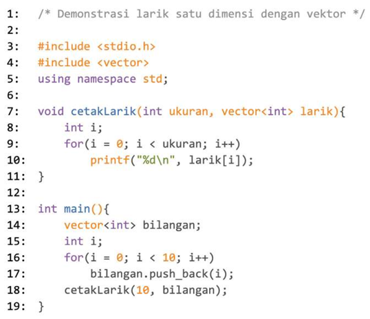 Terdapat berbagai macam cara untuk mengimplementasikan konsep larik ke dalam kode program, salah satunya dengan menggunakan vektor. Vektor merupakan pustaka bahasa pemrograman C++ yang dapat digunakan juga pada bahasa C. Vektor dibuat untuk menampung himpunan data yang ukurannya dinamis bergantung pada jumlah (atau ukuran) data yang disimpan di dalamnya.
