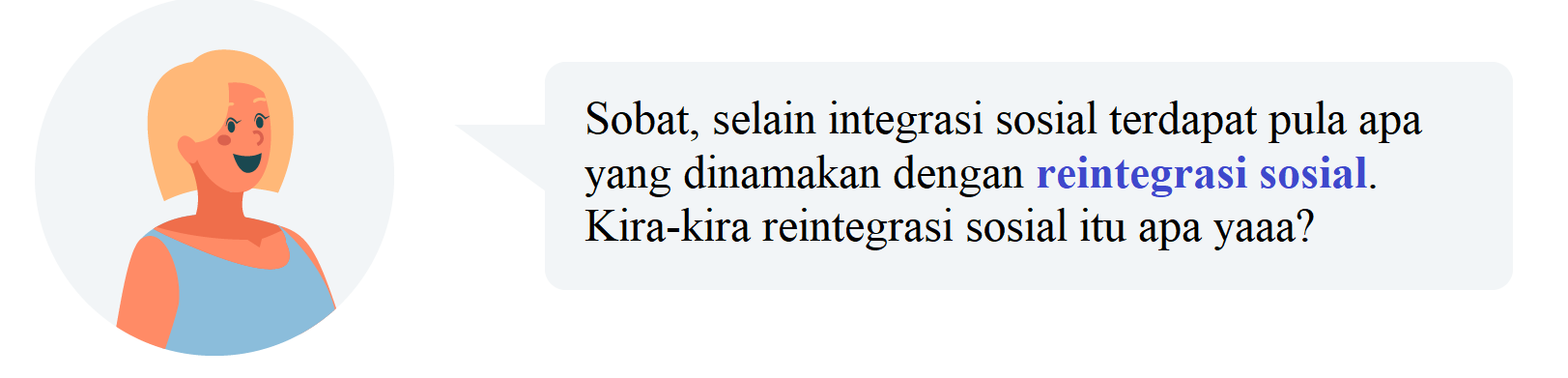 Selain istilah integrasi social, terdapat juga istilah mengenai reintegrasi social. Reintegrasi sosial didefinisikan sebagai suatu upaya untuk membangun Kembali kepercayaan sosial setelah terjadinya disintegrasi sosial. Nah, sobat pintar tau dong apa yang dimaksud dengan disintegrasi sosial? Disintegrasi sosial merupakan suatu perubahan kondisi yang seringkali terjadi karena adanya perubahan lingkungan, social, ekonomi, dan politik di masyarakat dimana situasi tersebut seringkali menimbulkan konflik yang tidak terkendali dan membutuhkan suatu reintegrasi sosial.