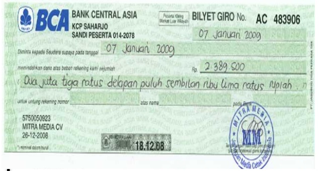 - Cek (Cheque) adalah perintah yang diterima dari pihak lain sebagai alat untuk melakukan pembayaran melalui bank.