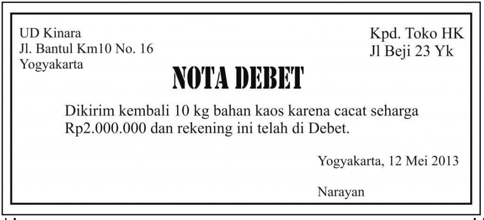 - Nota debit adalah nota yang yang berisikan dokumen transaksi sebagai permintaan pengurangan harga kepada pihak penjual atau bukti yang berisi informasi yang menyatakan tentang pengiriman kembali barang yang tidak sesuai dengan pesanan (rusak).