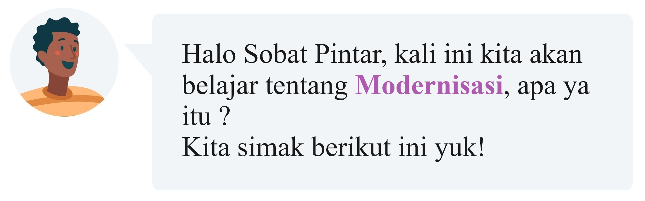 Modernisasi menyangkut perubahan sikap dan mentalitas, pengetahuan, keterampilan, serta struktur sosial masyarakat menuju suatu kehidupan yang modern sesuai dengan tuntutan zaman. Ciri-ciri manusia modern adalah 1) Menghormati hak dan kewajiban orang lain; 2) Lebih berorientasi pada masa kini; 3) Berpendirian kuat dan menghargai ilmu pengetahuan; 4) Menyadari potensi diri dan mau mengembangkannya; 5) Memiliki kepekaan terhadap masalah-masalah di sekitarnya; 6) Bersikap terbuka terhadap pengalaman dan penemuan baru; dan 7) Senantiasa mempunyai informasi yang lengkap. Kemudian menurut Peter L. Berger, modernisasi mempunyai karakteristik sebagai berikut: