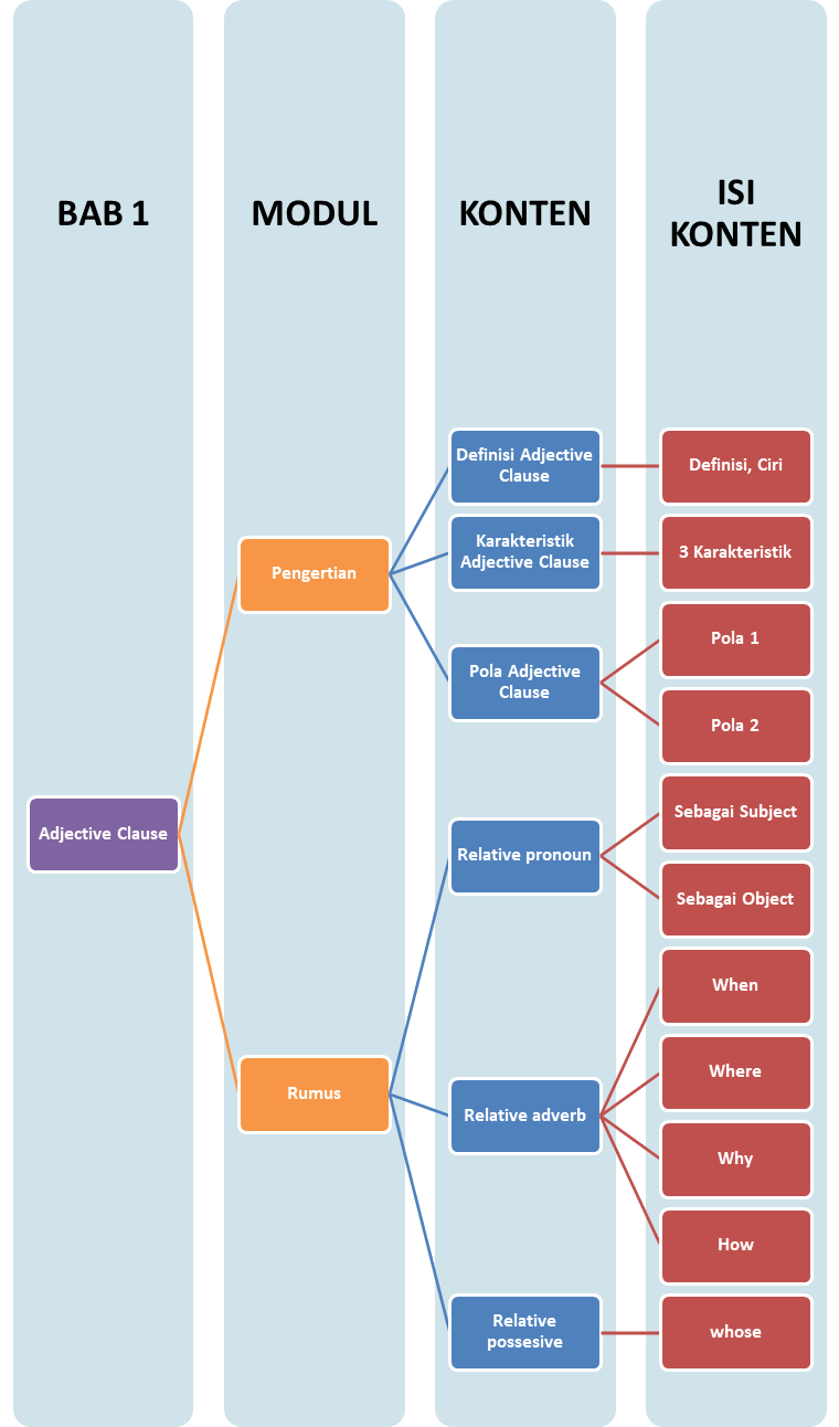 Adjective clause merupakan klausa yang tidak dapat berdiri sendiri atau disebut juga sebagai dependent clause, perannya adalah memodifikasi pronoun dan noun dalam suatu kalimat yang kompleks. Nah agar lebih mudah dalam mengenali adjective clause, kita bisa melihat ciri-cirinya lho sobat pintar.. Ciri kalimat ini adalah memiliki subjek dan predikat, serta diawali dengan relative pronoun (who, which, whose, that whom) atau relative adverb (when, why, where).