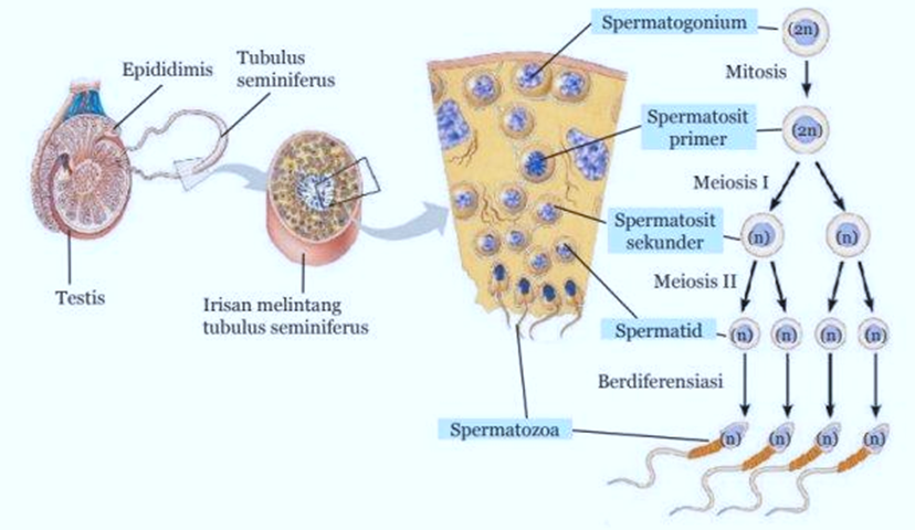 Pembentukan sperma terjadi ketika spermatogonium mengalami pembelahan mitosis menjadi spermatosit primer (sel sperma primer). Selanjutnya, sel spermatosit primer mengalami meiosis I menjadi dua spermatosit sekunder yang sama besar dan bersifat haploid. Setiap sel spermatosit sekunder mengalami meiosis II, sehingga terbentuk 4 sel spermatid yang sama besar dan bersifat haploid.