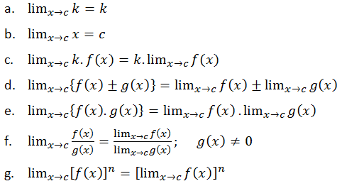 Jika f dan g merupakan fungsi-fungsi yang memiliki limit di c, k = konstanta dan n bilangan positif, maka berlaku sifat-sifat limit berikut: