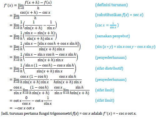 Turunan fungsi cosec dapat ditentukan dengan cara berikut;