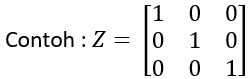 - Matriks identitas, yaitu: matriks persegi yang elemen pada diagonal utamanya adalah satu, sedangkan elemen lainnya adalah nol. Matriks identitas dilambangkan dengan “I”.