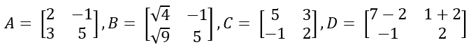 Matriks A=B karena ordo dan elemen yang letaknya bersesuaian besarnya sama. Matriks C=D karena ordo dan elemen yang seletak dari kedua matriks sama.