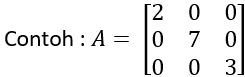 - Matriks diagonal, yaitu: matriks persegi yang semua elemennya nol, kecuali elemen pada diagonal utamanya bukan nol.