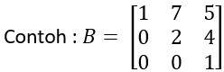 - Matriks segitiga atas, yaitu: matriks persegi yang semua elemen di bawah diagonal utamanya adalah nol.