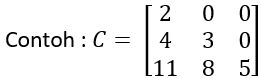 - Matriks segitiga bawah, yaitu: matriks persegi yang semua elemen di atas diagonal utamanya adalah nol.
