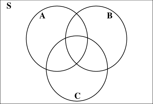 - Himpunan semesta (S) digambarkan sebagai persegi panjang dan huruf S diletakkan di sudut kiri atas.