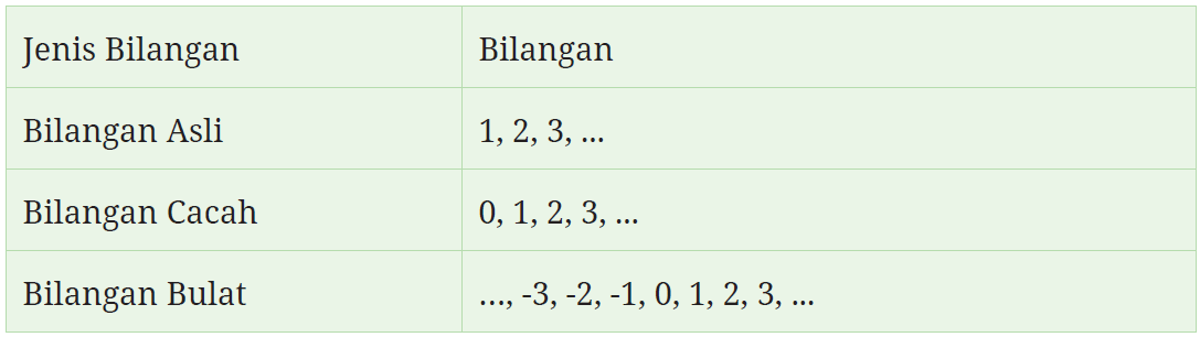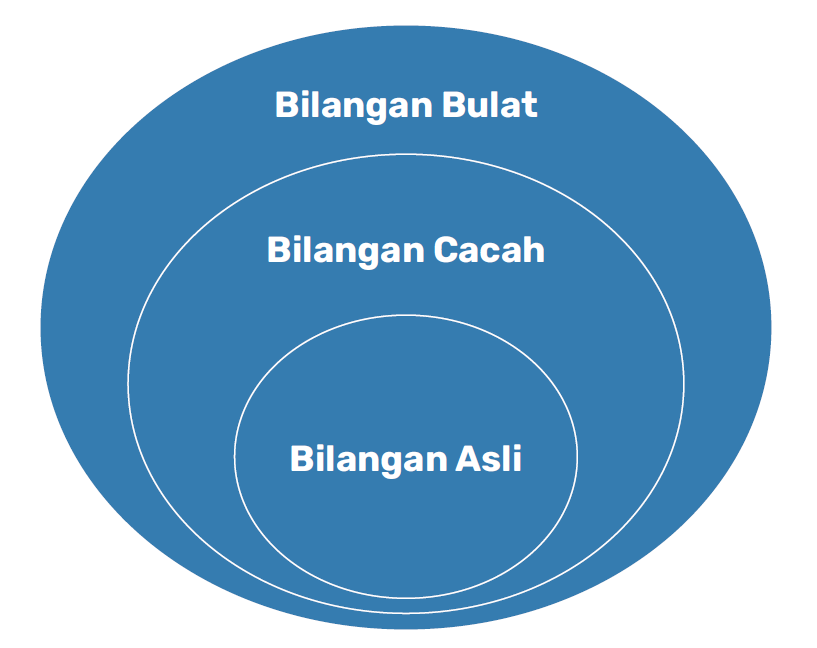 Hai Sobat Pintar, mari kita perhatikan tabel di atas. Apakah kalian bisa melihat kaitan antara jenis bilangan yang satu dengan yang lain? Tampak bilangan asli termasuk dalam kategori bilangan cacah, dan bilangan cacah juga merupakan bagian dari bilangan bulat. Berikut adalah gambaran visualnya menggunakan diagram Venn.