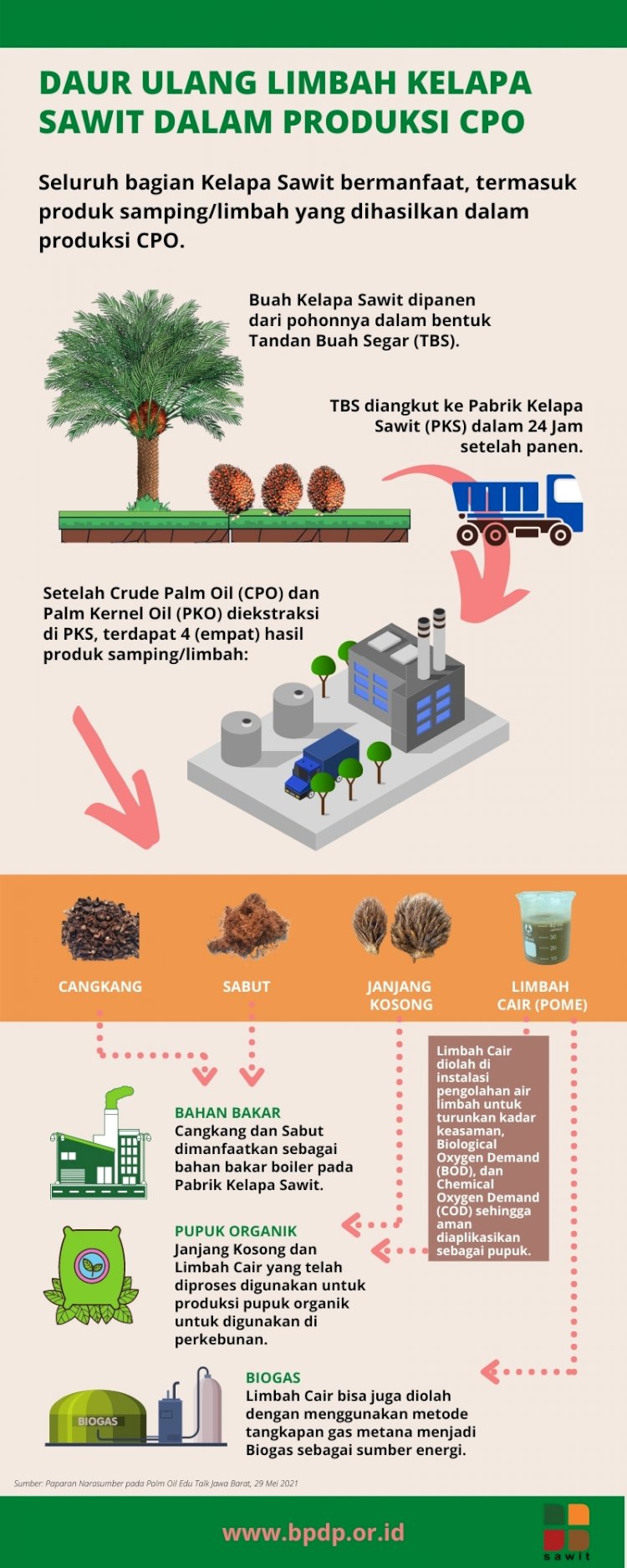 Pada gambar di atas, terdapat langkah-langkah pengolahan kelapa sawit, mulai dari buah hingga hasil produk samping atau limbahnya sehingga tidak menimbulkan masalah di masyarakat dan memiliki dampak berkelanjutan yang baik bagi lingkungan.