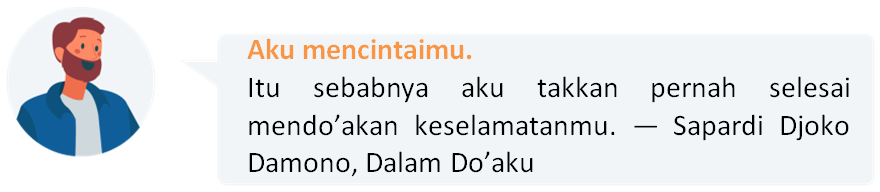 Penggalan puisi di atas diambil dari puisi yang berjudul “Dalam Do’aku” karya Pak Sapardi Djoko Damono. Sobat pintar bisa kan merasakan apa rasa yang diungkapkan dari penggalan puisi tersebut? Yap!! Dalam puisi tersebut Pak Sapardi mengungkapkan perasaan cinta dalam puisinya!
