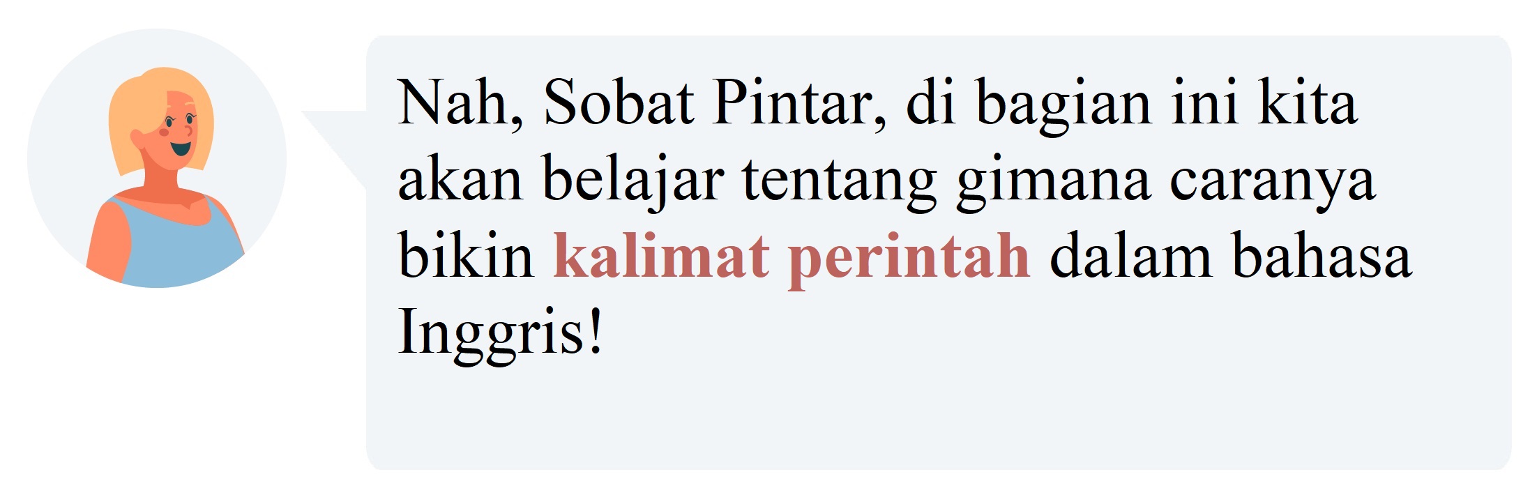 Biasanya kalimat-kalimat perintah ini dapat kita jumpai atau sering kita dengarkan pada kegiatan sehari-hari nih. Contohnya kaya pas di kelas, saat guru memberikan instruksi tugas, atau pas dirumah, Ibu memerintahkan kita untuk membersihkan kamar. Tidak hanya itu, kamu pasti juga pernah kan menyuruh seseorang untuk minta diambilin ini itu. Nah, kita juga harus tau nih Sobat, gimana caranya membuat kalimat perintah dalam bahasa Inggris.
