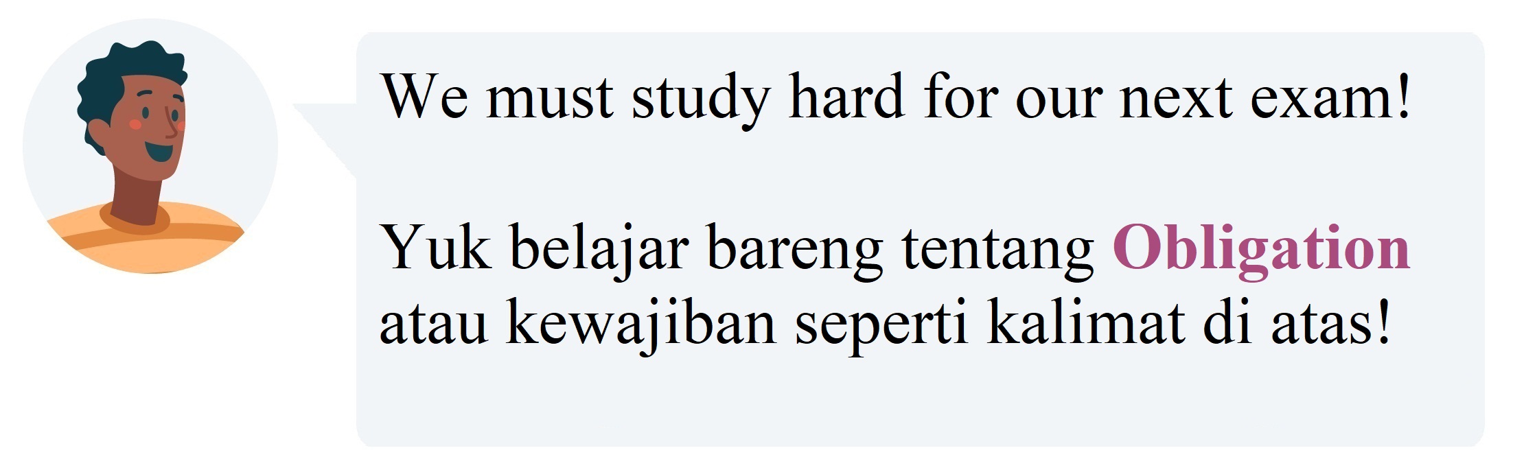 Nah Sobat, kalau obligation itu maksudnya keharusan melakukan sesuatu. Contohnya, kita pasti memiliki kewajiban seperti beribadah, belajar, mematuhi peraturan, dan lain-lain Dalam bahasa Inggris, keharusan melakukan sesuatu atau obligation bisa menggunakan kata seperti di bawah ini ya Sobat!