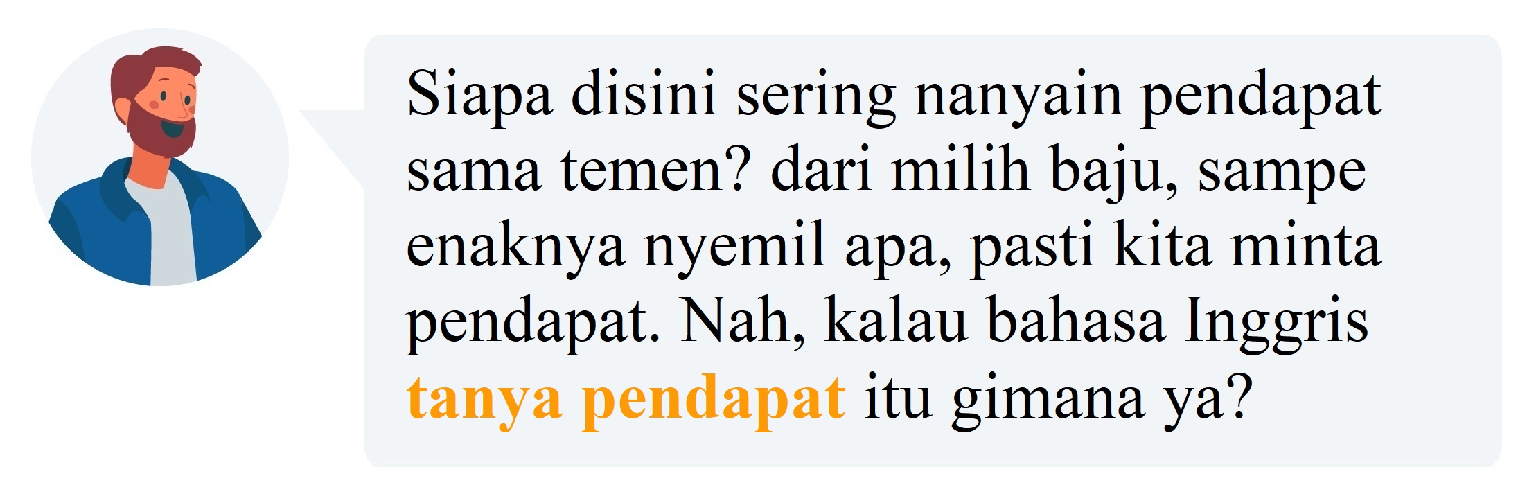Sobat pintar, jika kalian ingin meminta atau memberi pendapat dalam bahasa inggris, kalian bisa menggunakan Expression of asking for and giving opinion.