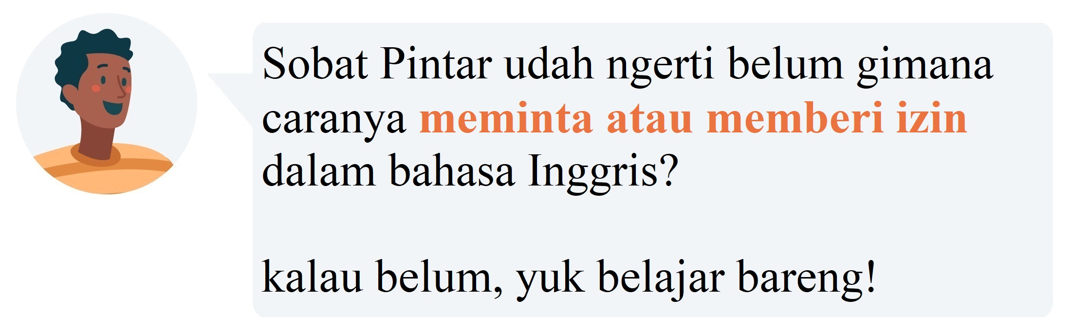 Pada kehidupan sehari-hari sobat pintar pasti pernah meminta izin kepada seseorang untuk meminjam sesuatu, atau untuk izin pergi ke suatu tempat, atau izin melakukan suatu kegiatan Sobat pintar pastinya meminta itu dengan sopan. Dalam bahasa Inggris, meminta izin disebut dengan Asking for permission. Nah,gimana caranya? Yuk simak contoh ungkapan-ungkapan asking for permission di bawah ini!