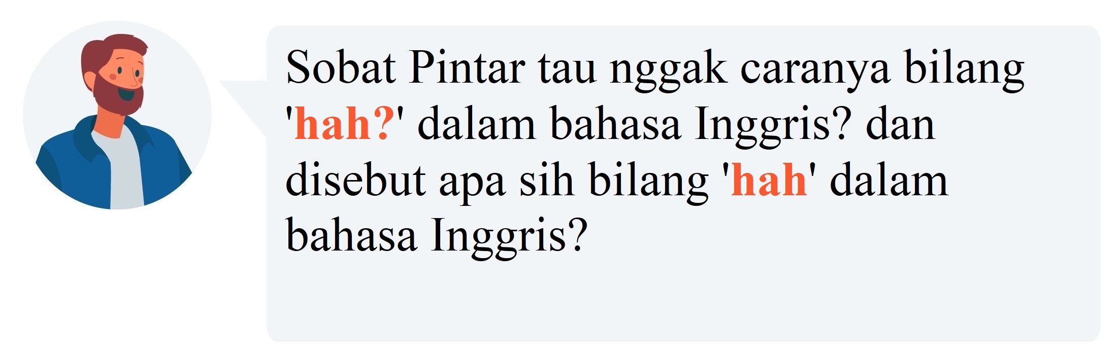Maksud ‘hah?’ disini itu meminta seseorang untuk mengulangi perkataannya ya Sobat! karena dalam berinteraksi dengan orang lain terkadang kita juga pernah kurang memahami apa yang dimaksud dengan orang lain sehingga kita meminta orang lain mengulang apa yang baru saja mereka katakan.