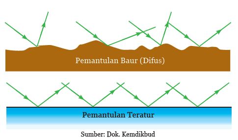 Apakah kamu dapat membedakan benda-benda berdasarkan warnanya? Apa yang menyebabkan demikian? Cahaya memiliki sifat dapat dipantulkan jika menumbuk suatu permukaan bidang. Pemantulan yang terjadi dapat berupa pemantulan baur dan pemantulan teratur. Pemantulan baur terjadi jika cahaya dipantulkan oleh bidang yang tidak rata, seperti aspal, tembok, dan batang kayu. Pemantulan teratur terjadi jika cahaya dipantulkan oleh bidang yang rata, seperti cermin datar. Pada pemantulan baur dan pemantulan teratur, sudut pantulan cahaya besarnya selalu sama dengan sudut datang cahaya