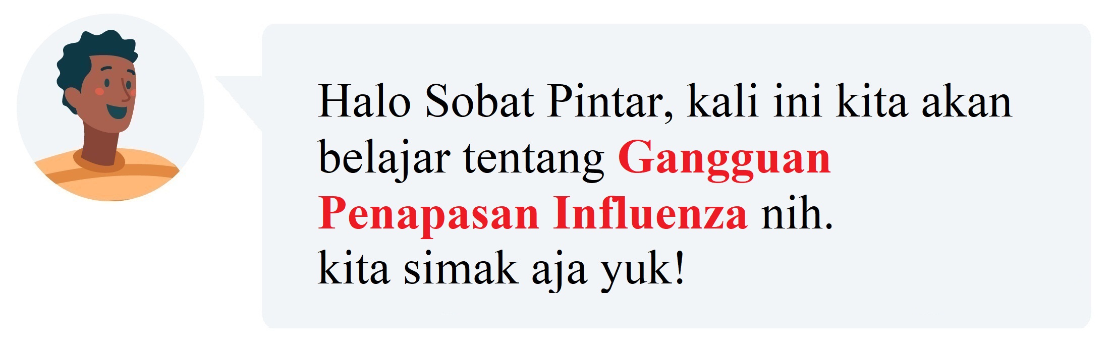 Influenza merupakan penyakit yang disebabkan oleh infeksi influenza virus. Gejala umum influenza yaitu, demam dengan suhu lebih dari 39oC, pilek, bersin-bersin, batuk, sakit kepala, sakit otot, dan rongga hidung terasa gatal. Dengan kondisi hidung tersumbat, penderita influenza akan kesulitan untuk bernapas. virus infuenza keluar dari tubuh seseorang bersamaan dengan batuk dan pilek, kemudian disebarkan melalui udara. Selain itu, virus juga dapat menular ketika seseorang menyentuh permukaan yang terkontaminasi virus, kemudian orang tersebut menyentuh mulut dan mata. Agar kamu tidak mudah tertular virus influenza, sebaiknya kamu selalu menggunakan masker ketika berkendaraan dan rajin mencuci tangan dengan menggunakan sabun sebelum makan.