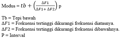 Modus merupakan nilai yang paling sering muncul. Apabila ada data data frekuensi, jumlah dari suatu nilai dari kumpulan data, maka bisa memakai modus. Untuk bisa melihat hasil akhir dari modus maka kita harus menentukan kelas pada tabel dengan memilih frekuensi yang paling banyak. Lihat detail rumusnya dibawah ini