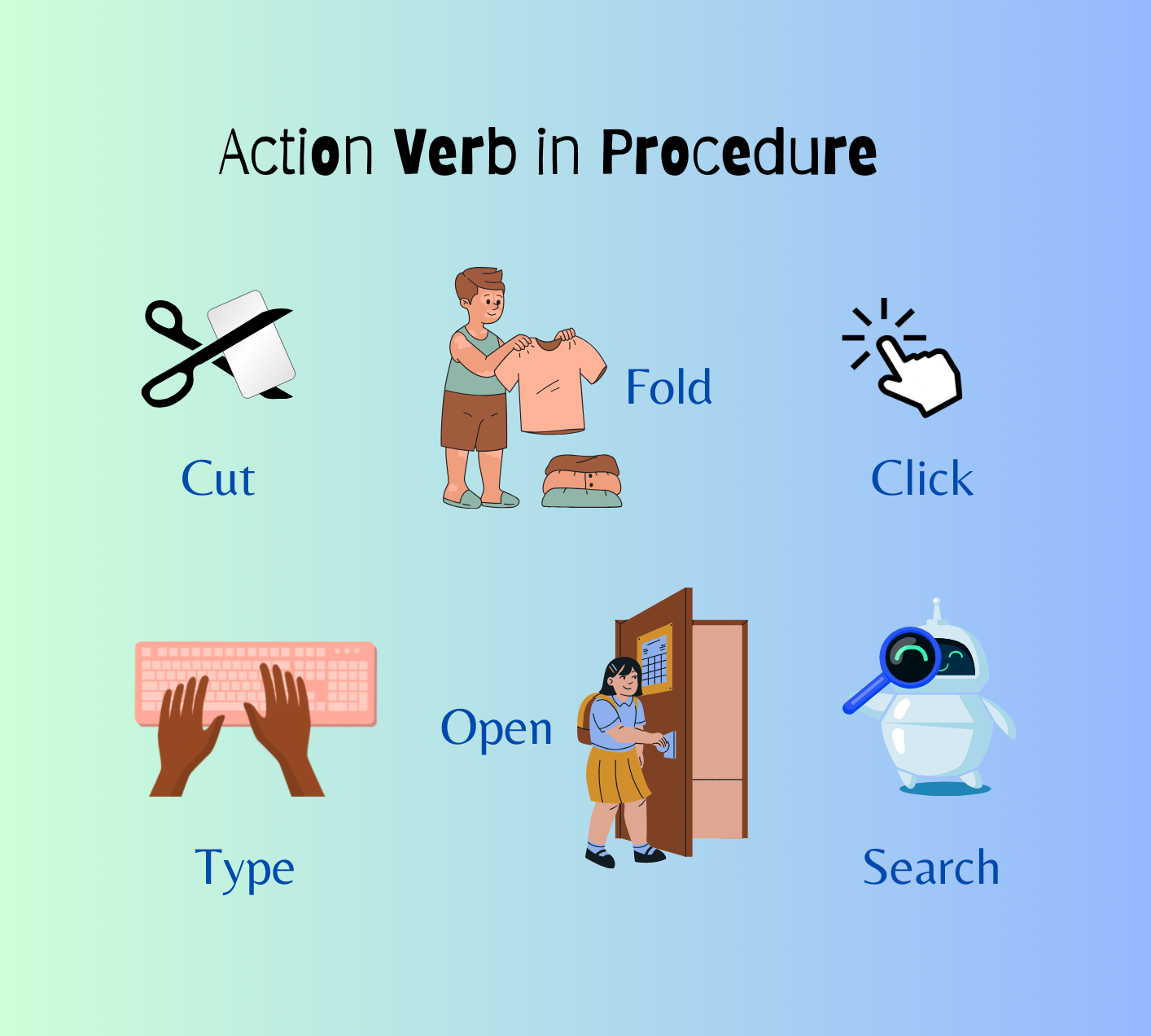 Berisi tentang langkah-langkah yang perlu dilakukan. Langkah-langkah tersebut dijelaskan secara rinci dan berurutan. Karena ini adalah procedure dan bersifat teknis, maka urutan langkah-langka tersebut sangat penting dan tidak boleh tertukar. Biasanya diawali dengan kata squence of time seperti first, second, third dan lainnya.