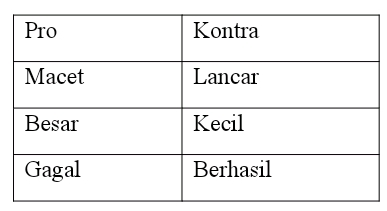 Antonim disebut dengan lawan kata. Hubungan makna ini digunakan untuk menyatakan hubungan makna yang berlawanan terhadap suatu kata. Contoh: