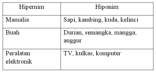 Hiponim dan hipernim saling berkaitan satu sama lain. Arti dari hiponim adalah kata khusus, sedangkan hipernim adalah kata umum. Kata-kata yang tergolong dalam hiponim terkandung dalam suatu kelompok tertentu.