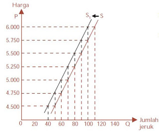 Perhatikan kurva penawaran di atas. Kurva penawaran S bergeser ke kiri menjadi S1. Hal ini menunjukkan bahwa jumlah penawaran akan jeruk mengalami penurunan. Penurunan kurva penawaran jeruk tersebut sebagai akibat dari meningkatnya harga pupuk.