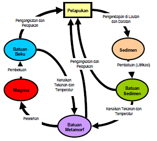 Sobat Pintar, batu-batuan mengalami siklus sebagaimana diperlihatkan dalam bagan di bawah ini.