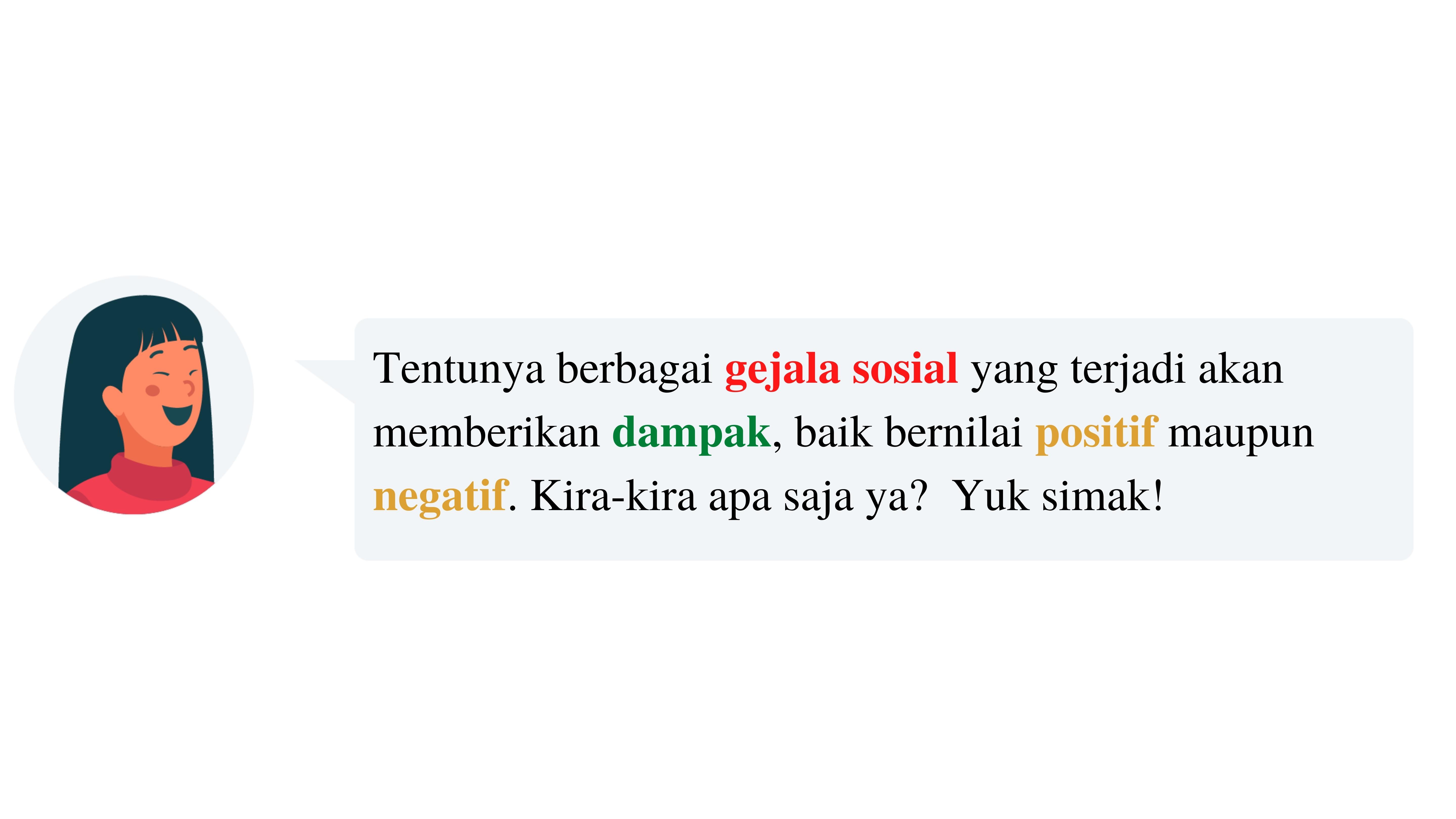 Gejala sosial yang ada dalam masyarakat harus disikapi dengan baik. Apabila kita terbuka dan mengimbangi perubahan sosial busaya yang ada maka perubahan tersebut akan memberikan dampak positif bagi kita. Hal ini dapat dilihat dengan adanya kemajuan di bidang ateknologi salah satunya teknologi komunikasi dengan alat komunikasi modern seperti smartphone dan alat komunikasi modern lainnya yang membuat kita dapat berinteraksi jarak jauh tanpa harus bertemu secara langsung.