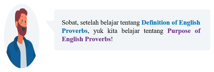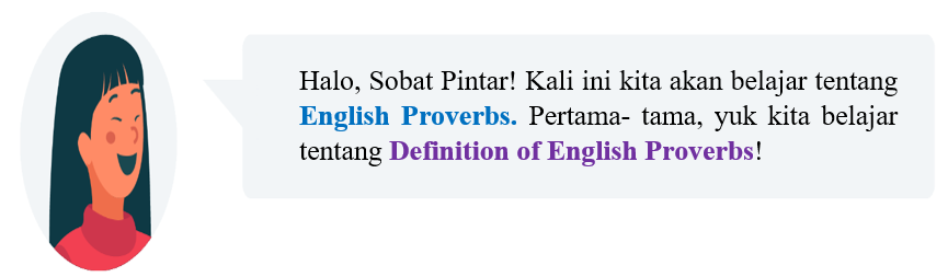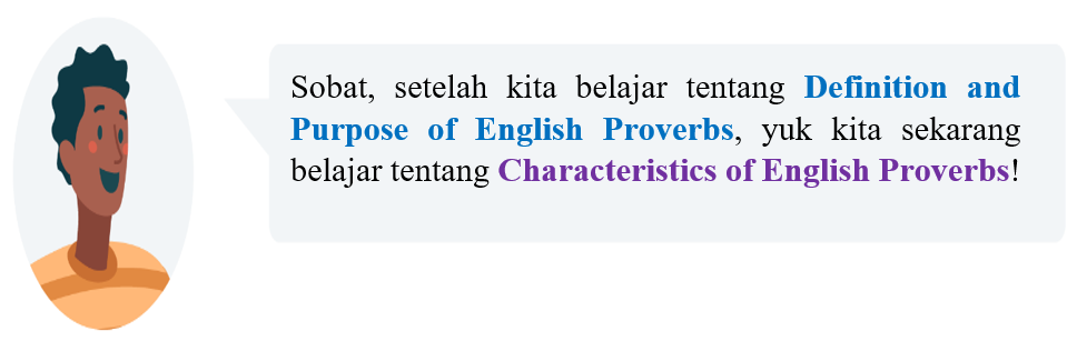 Proverbs adalah kalimat sederhana atau pendek yang biasanya digunakan untuk menggambarkan sesuatu atau kebenaran nyata yang bertujuan untuk mendidik melalui kata-kata mutiara atau yang juga dikenal dengan peribahasa. Peribahasa juga dapat diartikan sebagai ungkapan yang tidak langsung tetapi tersirat untuk menyampaikan sesuatu yang dapat dipahami oleh pembaca atau pendengar. (Proverbs are simple or short sentences that are usually used to illustrate something or real truths that aim to educate through aphorisms or also known as proverbs. Proverbs can also be interpreted as expressions that are not direct but implied to convey something that can be understood by the reader or listener).