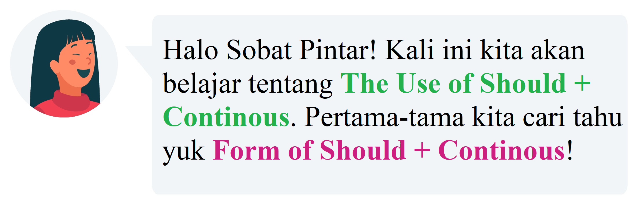 Dalam penggunaan should + continuous, perlu diperhatikan jika form yang digunakan adalah subject + should + be + v-ing. Pertanyaannya adalah kalimat yang benar dalam penggunaan should + continuous.