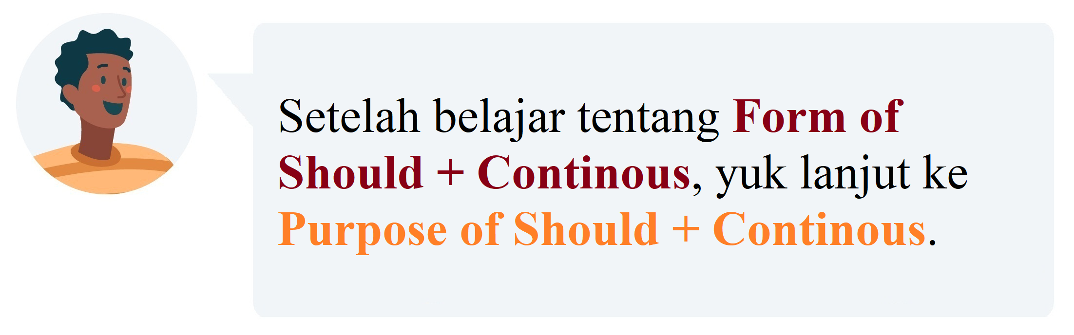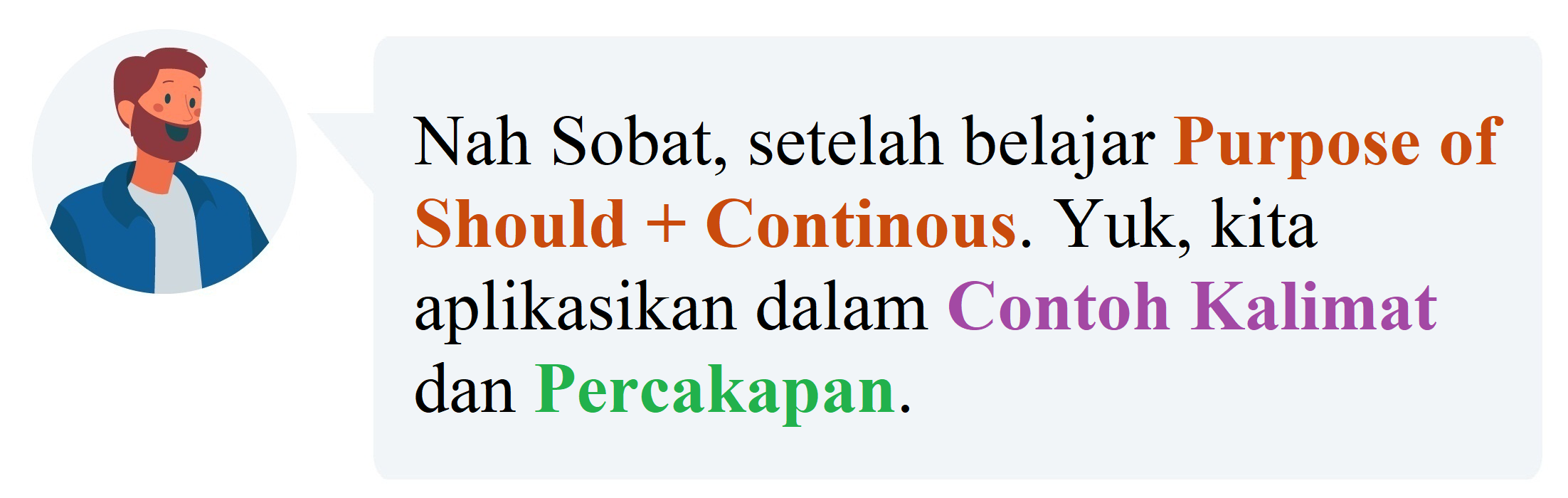 Kita sudah mempelajari tujuan dari penggunaan should + continuous, hanya ada 1 tujuan/ purpose yaitu to express an idea that the subject does not fulfil.