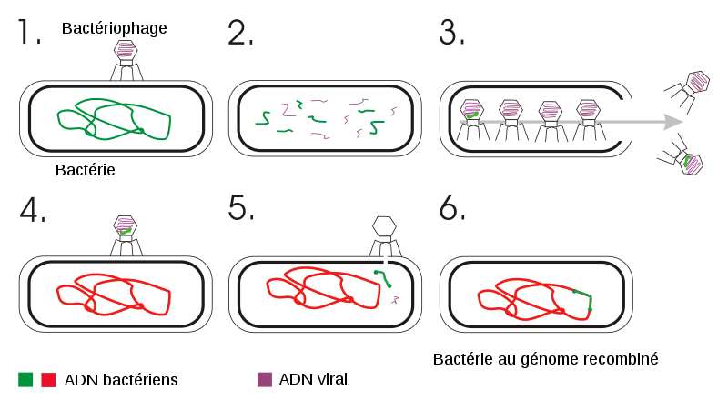 2. Transduksi, yaitu pemindahan materi genetik dari sel menggunakan perantara virus fag temperat (virus yang dapat bereproduksi secara litik maupun lisogenik).