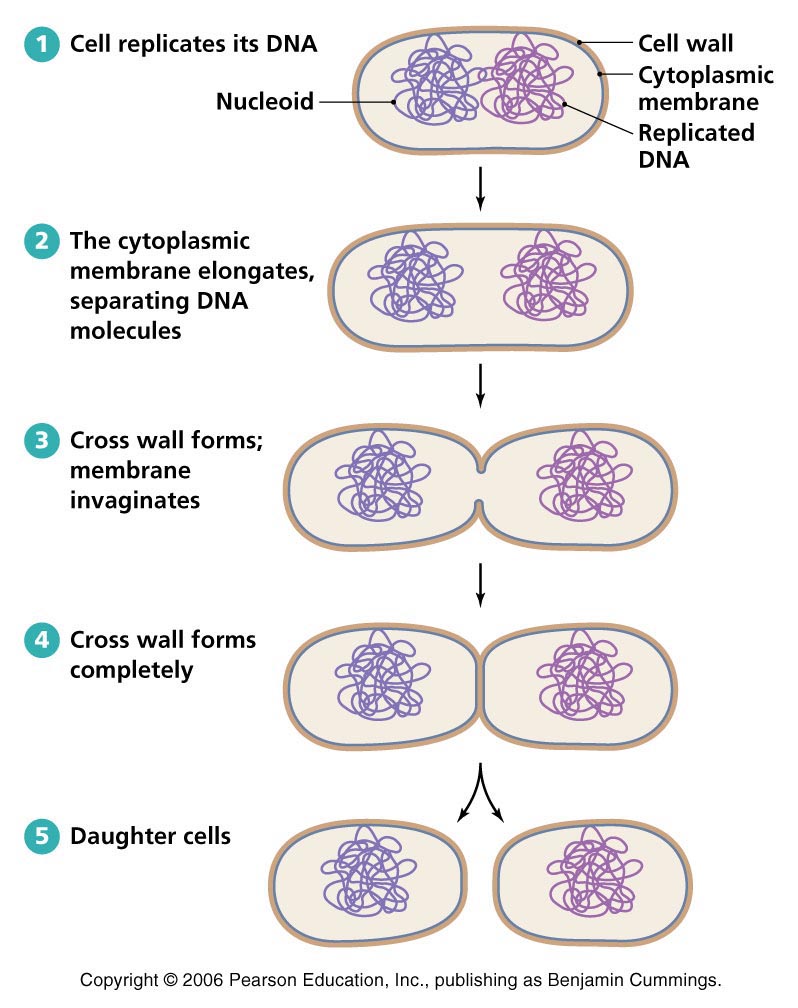 Reproduksi bakteri tipe ini dapat dilakukan melalui pembelahan biner secara amitosis, yaitu terjadi secara langsung tanpa melalui tahapan tertentu seperti pada pembelahan mitosis. Adapun pembelahan biner bakteri mengacu pada rumus 2n, dimulai dari 1 bakteri membelah menjadi 2 sel, kemudian 4 sel, 8 sel, dan seterusnya. Pada umumnya, bakteri dapat membelah sekitar 1-3 jam sekali, misalnya pada Eschericia coli yang mampu membelah setiap 20 menit sekali.