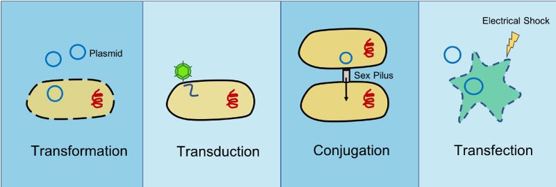 1. Transformasi, yaitu pengambilan sebagian materi genetik secara langsung yang dilakukan oleh sel bakteri. Transformasi dapat dilakukan secara alami maupun diinduksi secara artifisial (buatan). Metode ini banyak dimanfaatkan untuk kloning gen.