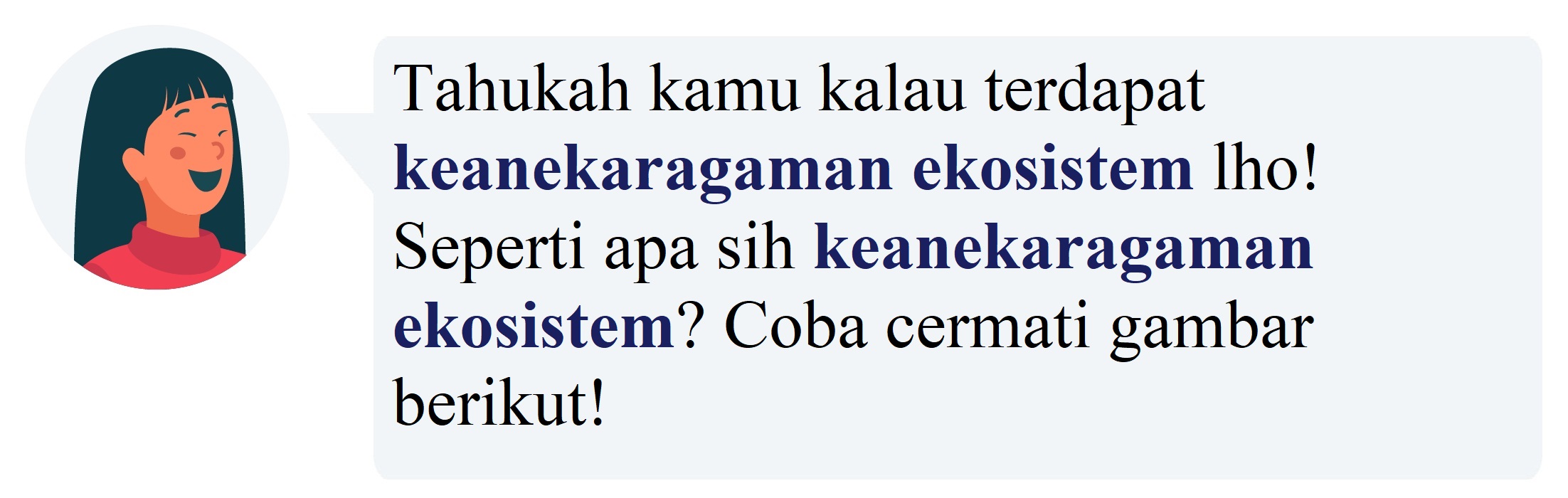 Interaksi antara makhluk hidup dengan lingkungannya membentuk ekosistem. Dengan keanekaragamannya kondisi lingkungan dan keanekaragaman hayati, maka terbentuklah keanekaragaman ekosistem. Hutan bakau, sawah, kebun, sungai, dan laut termasuk contoh ekosistem.