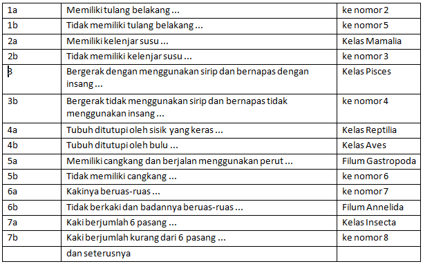 3. Jika ciri-ciri pada kunci tidak sesuai dengan ciri makhluk hidup yang diamati, harus beralih pada pernyataan yang ada di bawahnya dengan nomor yang sesuai. Misalnya, pernyataan 1a tidak sesuai, beralihlah ke pernyataan 1b.