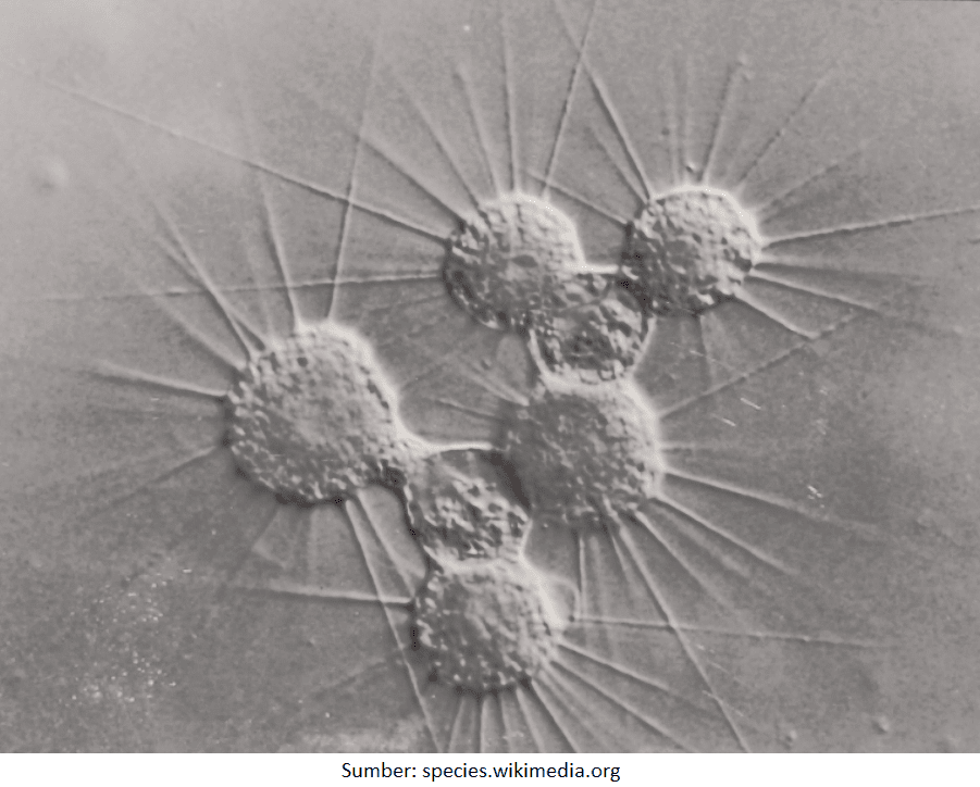 - Rhizopoda bergerak dengan kaki semu (pseudopodia). Rhizopoda juga biasa disebut dengan Sarcodina.