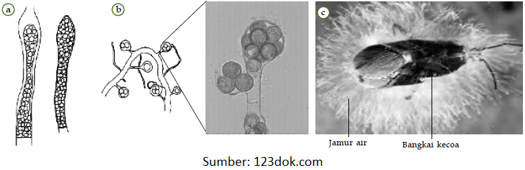 Contoh Protista dari kelompok Oomycota. (a) Bentuk zoosporangia pada Saprolegnia sp. yang akan menghasilkan zoospora, (b) bentuk oogonia pada Saprolegnia sp. yang menghasilkan oogonium, dan (c) jamur air yang tumbuh pada kecoa untuk dirombak atau diuraikan.