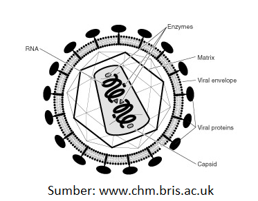 - Virus Tipe VI = RNA Utas Tunggal bermuatan positif dilengkapi dengan DNA perantara