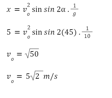 Eko menendang bola di lapangan Lidah dengan sudut elevasi 45o. Jatuhnya bola memiliki jarak horizontal 5 meter. Berapakah kecepatan awal tendangan Eko jika percepatan gravitasi 10 m/s2?