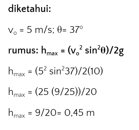 Dimas menendang bola dengan kecepatan awal 5 m/s dan membentuk sudut 37o. Berapakah ketinggian maksimum dari tendangan bola Dimas ?