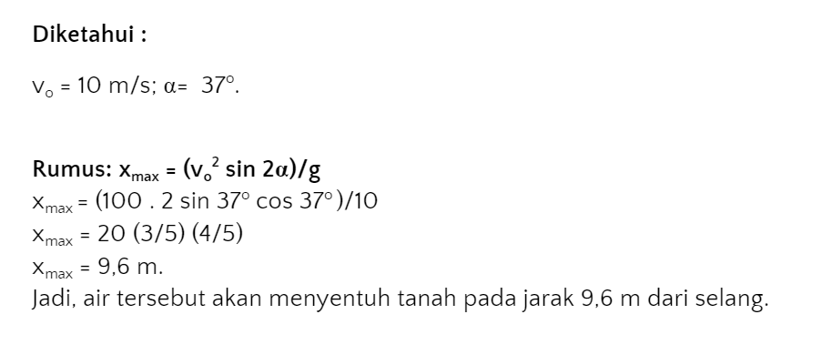 Jika sebuah selang air menyemprotkan air ke atas dengan kecepatan 10 m/s pada sudut 37o , berapakah jarak tempuh maksimum air tersebut!