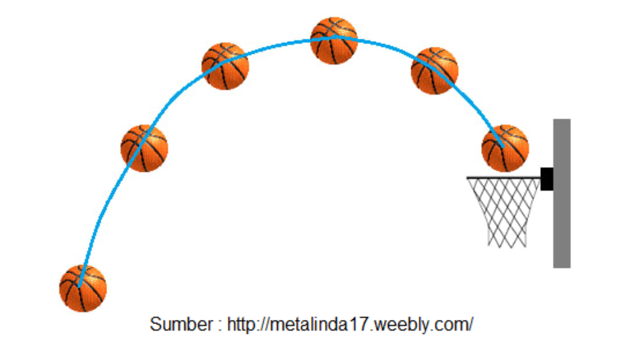 Pada gambar tersebut bola basket dilempar ke atas dengan sudut elevasi tertentu dan pada sudut tertinggi bola basket hanya memiliki kecepatan pada arah-x sehingga bola membentuk lintasan parabola.