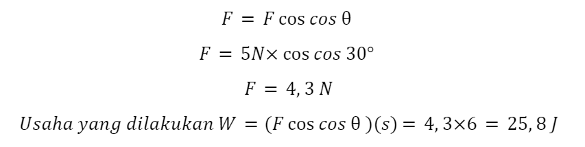 Sebuah truk mainan ditarik oleh gaya 5 N membentuk sudut sebesar 30 derajat terhadap horizontal. Massa truk 1,5 kg. Berapa kerja yang dilakukan bila lantai licin?