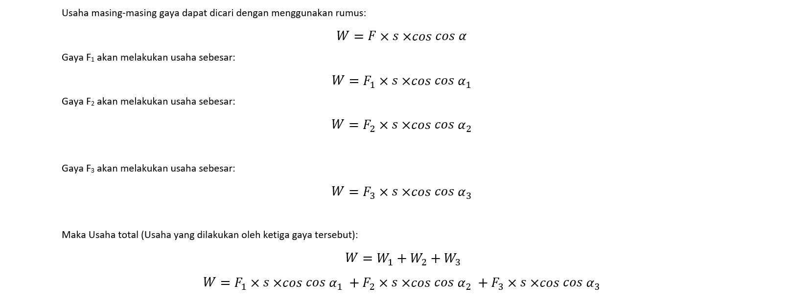 Seandainya pada sebuah benda bekerja 3 buah gaya F1 , F2, dan F3 sehingga benda mengalami perpindahan sejauh s. Gaya F1 membentuk sudut1 dengan vektor s, F2 membentuk sudut2 , dan F3 membentuk sudut3. Berapakah usaha oleh ketiga gaya tersebut terhadap benda?
