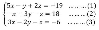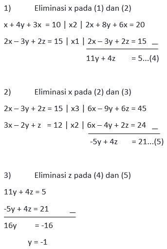 Jadi, himpunan penyelesaian untuk x, y, dan z secara berturut-turut adalah 2, -1, dan 4.